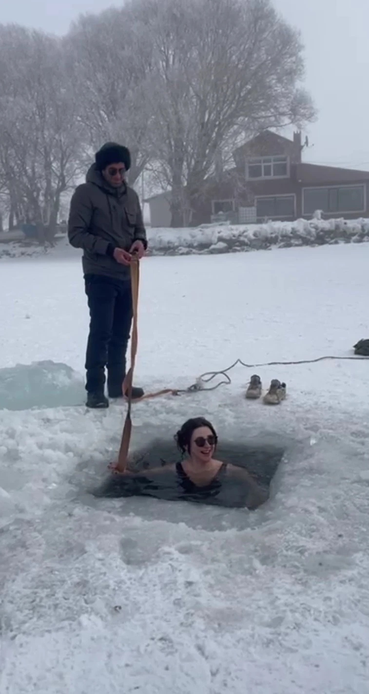 Her gün yüzlerce turistin ziyaret ettiği Çıldır Gölü, ilginç görüntülere sahne oluyor. Bir kadın Çıldır Gölü’nde buzlu suya girerek yaklaşık 30 saniye suyun içerisinde kaldı. O anlar soysal medyada viral oldu.