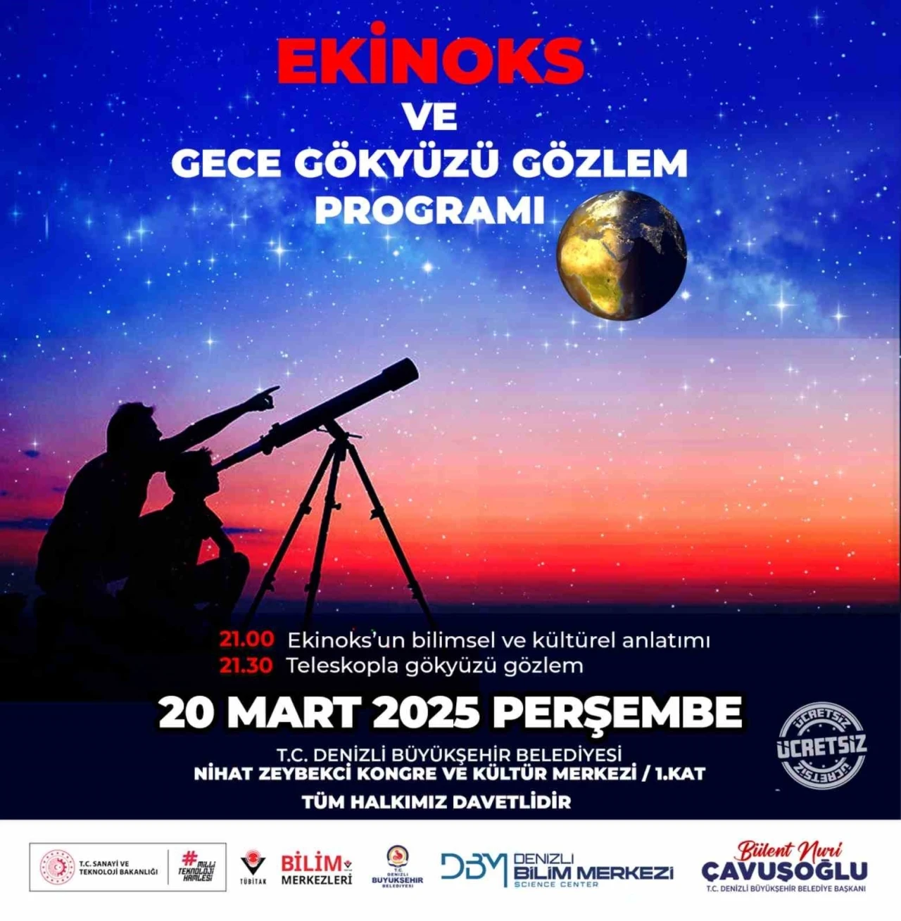 Denizli Büyükşehir Belediyesi, ilkbahar ekinoksu için gökyüzü tutkunlarını bir araya getirecek. Denizli Bilim Merkezi tarafından hazırlanan programda, ekinoksun astronomik mekanizması, farklı kültürlerdeki yeri ve mitolojik anlamları detaylı bir şekilde ele alınacak. Nihat Zeybekci Kongre ve Kültür Merkezi’nde gerçekleşecek etkinlik 20 Mart 2025 Perşembe günü saat 21.00’de başlayacak. Katılımcılar, önce uzmanlar tarafından yapılacak bilgilendirici sunumu dinleyip ardından teleskoplarla yıldızları ve gezegenleri inceleme fırsatı bulacak. Gecenin ilerleyen saatlerinde ise katılımcılar, teleskoplarla gezegenleri, yıldız kümelerini ve derin uzayı keşfetme fırsatı bulacak. Astronomi meraklıları ve doğa olaylarına ilgi duyan herkesin katılımına açık olan etkinlik ücretsiz olarak gerçekleştirilecek. Programa, Denizli’deki çeşitli liselerden öğrenciler de katılacak.