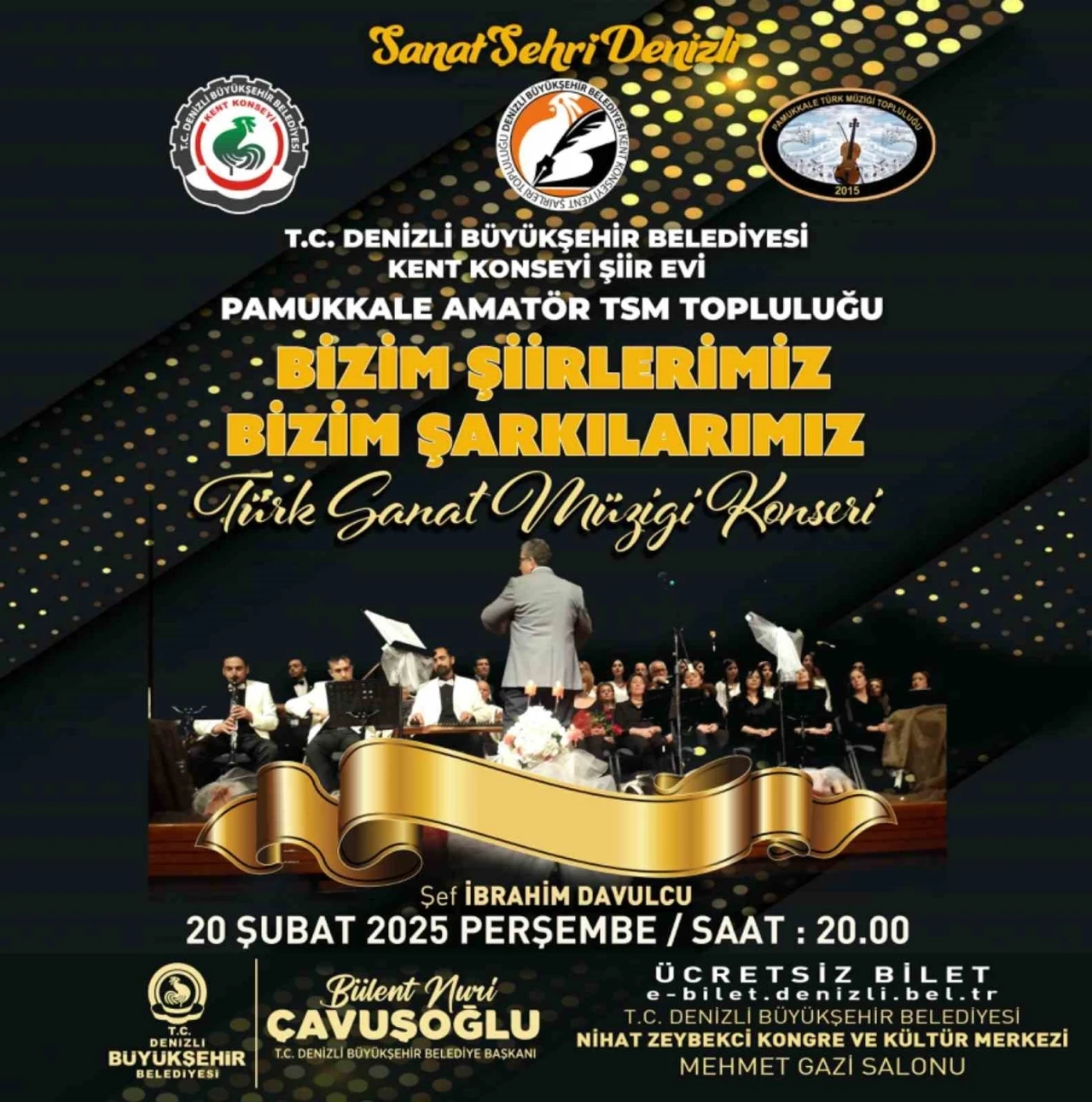 Denizli Büyükşehir Belediyesi, Kent Konseyi Şiir Evi ve Pamukkale Amatör TSM Topluluğu ortaklığında "Bizim Şiirlerimiz, Bizim Şarkılarımız" adlı Türk Sanat Müziği konseri düzenleyecek. Kent Konseyi Şiir Evi ve Pamukkale Amatör TSM Topluluğu işbirliği ile düzenlenen "Bizim Şiirlerimiz Bizim Şarkılarımız" adlı Türk Sanat Müziği konseri, 20 Şubat 2025 Perşembe günü saat 20.00’de Nihat Zeybekci Kongre ve Kültür Merkezi Mehmet Gazi Salonu’nda gerçekleşecek. Şef İbrahim Davulcu yönetimindeki koro, Türk Sanat Müziği’nin en sevilen eserlerini Denizlililerle buluşturacak. Müzikseverler için anlamlı bir etkinlik olan bu konserin biletleri ücretsiz olup, e-bilet.denizli.bel.tr adresinden temin edilebilecek.