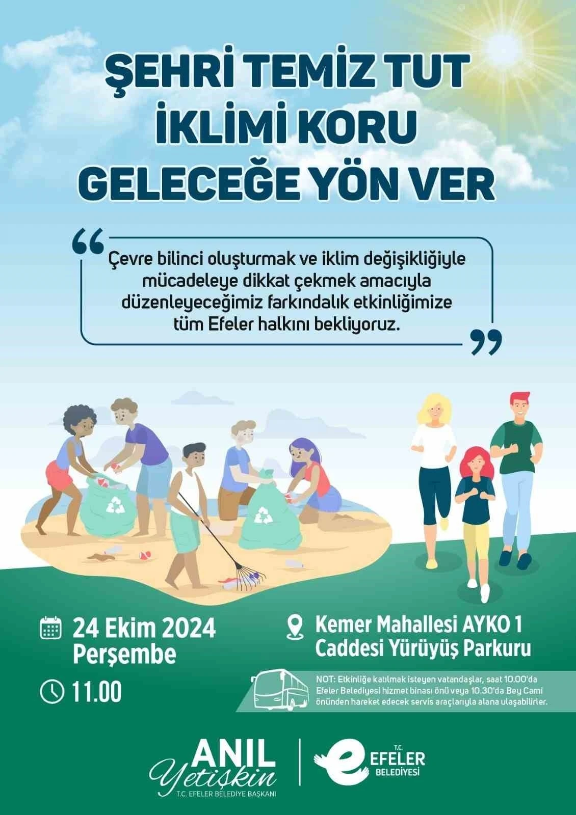 Efeler Belediyesi, çevre bilinci oluşturmak ve iklim değişikliğiyle mücadeleye dikkat çekmek amacıyla 24 Ekim 2024 Perşembe günü ’Şehri Temiz Tut, İklimi Koru, Geleceğe Yön Ver!’ sloganıyla kapsamlı bir farkındalık etkinliği düzenleyecek . Organizasyon kapsamında çevre kirliliğinin şehirler ve doğal alanlar üzerindeki olumsuz etkilerine dikkat çekilerek, daha temiz bir çevre ve sağlıklı bir gelecek için atılması gereken adımlar vurgulanacak. Vatandaşlar, çöp toplama ve yürüyüş gibi aktivitelerle hem fiziksel olarak çevre temizliğine katkıda bulunacak hem de geri dönüşüm ile atık yönetimi konusundaki farkındalıklarını artıracaklar. Bu kapsamda katılımcılara, çevreyi koruma konusunda bireylere düşen sorumluluklar hatırlatılacak. Ayrıca, doğaya zarar veren atıkların ortadan kaldırılması ve geri dönüşümün teşvik edilmesi amacıyla çeşitli atölye çalışmaları da yer alacak. Kemer Mahallesi AYKO 1 Caddesi Yürüyüş Parkuru’nda saat 11.00’de başlayacak olan etkinliğe katılmak isteyen vatandaşların saat 10.00’da Efeler Belediyesi hizmet binası önü veya 10.30’da Bey Cami önünden hareket edecek servis araçlarıyla alana ulaşabileceklerini belirten Efeler Belediye Başkanı Anıl Yetişkin, tüm Efeler halkını etkinliğe davet etti.