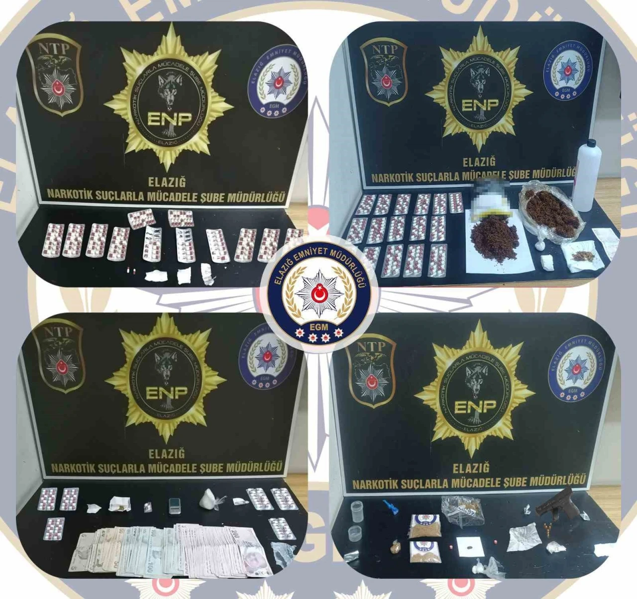 Elazığ İl Emniyet Müdürlüğü Narkotik Suçlarla Mücadele Şubesi ekipleri, kent genelinde uyuşturucu ile mücadele çalışmalarını sürdürüyor. Ekipler tarafından yapılan operasyonlarda 8 parça halinde 1 kilo 92,38 gram sentetik kannabinoid maddesi, 10 parça halinde 63,92 gram metamfetamin maddesi, 471 adet sentetik ecza maddesi, 1 adet ruhsatsız tabanca ve tabancalara ait 7 adet fişek, 1 adet hassas terazi ve uyuşturucu madde ticaretinden elde edildiği değerlendirilen 12 bin 710 lira ele geçirilirken, 29 kişi gözaltına alındı. Cumhuriyet Başsavcılığı koordinesinde İl Emniyet Müdürlüğünde ifadeleri tamamlanan 29 şüpheliden 7’si tutuklanarak cezaevine gönderilirken, 21 şüpheli şahsa uyuşturucu madde kullanmak suçundan işlem yapıldı. 1 şüpheli ise adli kontrol şartıyla serbest bırakıldı.