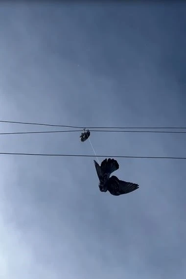 Hanak ilçesine bağlı Selamverdi Mahallesi’nde bilinçsizce ayağına ip bağlanıp bırakılan Güvercin yüksek gerilim elektrik hattına takıldı. Elektrik tellerinde asılı kalan güvercini gören vatandaşlar ihbarda bulundu.