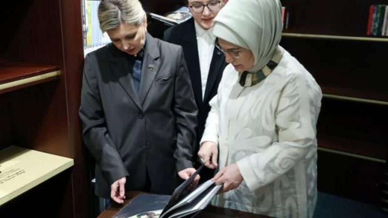 Cihannüma Salonu'nu gezen Emine Erdoğan ve Zelenska, Ukrayna özel bölümünde yer alan kitapları inceledi.
