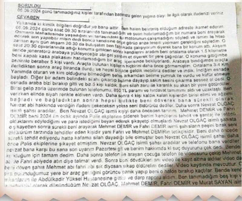 Şikayet dilekçesinde yaşadığı korkunç anları anlatan Ercan Öztürk, “Telefonu Nevzat’a verdiler ‘Sana son uyarım, benim hakkımdaki suç duyurunu çek’ dedi. Korktuğum için ‘tamam’ dedim. Çocuğa telefonla videosunu çekip Mehmet abi Fahri abiye atın diye talimat verdi” dedi. Öztürk, Suriyelilerin telefonunu, 850 TL parasını ve hırdavat takımını aldıklarını söyledi.