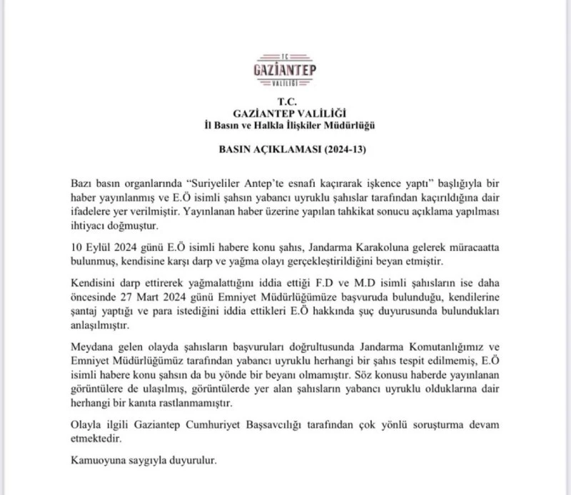 Açıklamada ayrıca, güvenlik birimlerinin araştırmaları sonucunda, olayda yer alan şahısların yabancı uyruklu olduğuna dair herhangi bir kanıt bulunmadığı belirtildi. Haberdeki iddiaların aksine, mağdurun da yabancı uyruklu kişilerle ilgili herhangi bir beyanının olmadığı vurgulandı.
