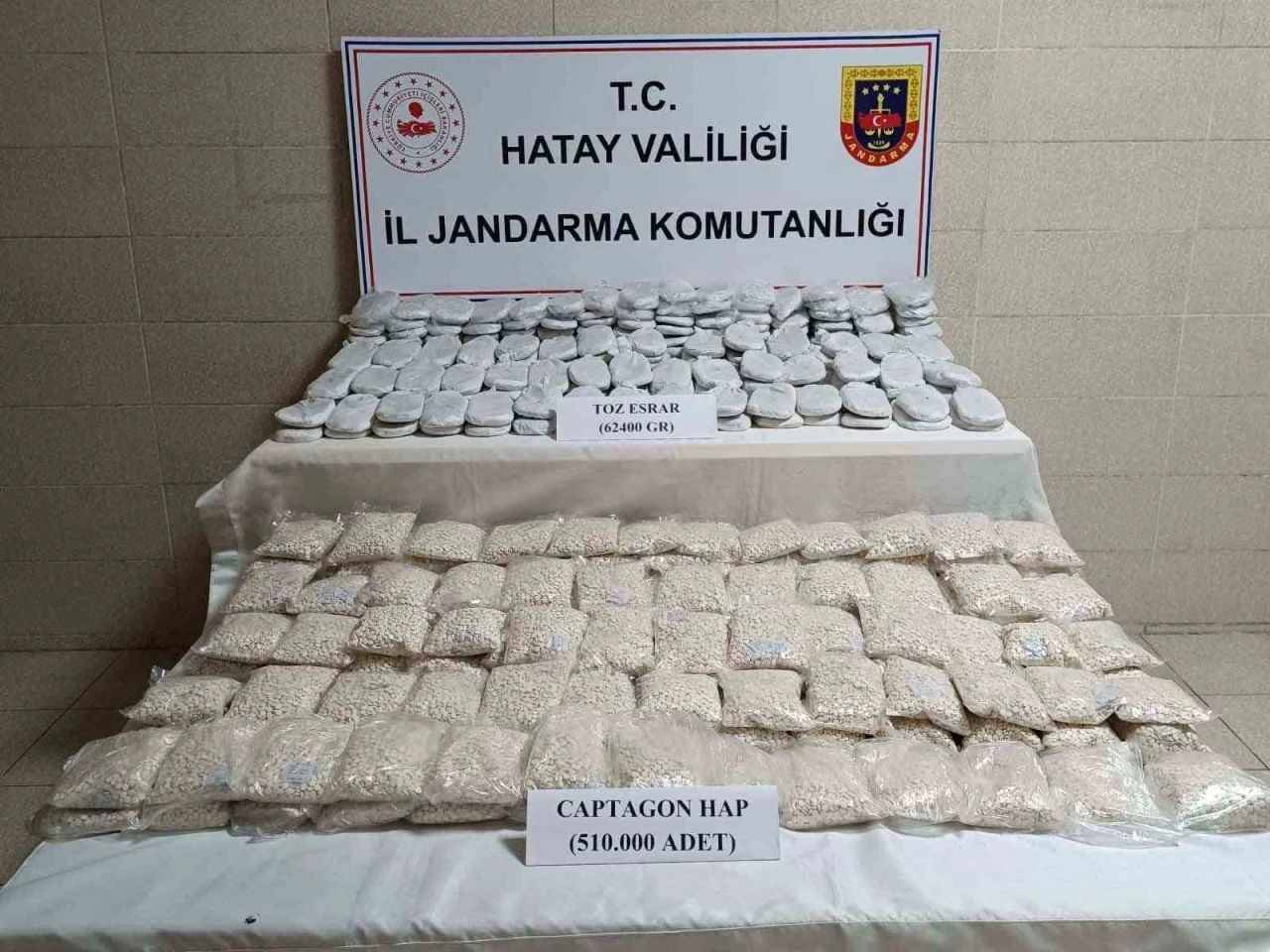 Hatay’da jandarma komutanlığı ekipleri uyuşturucu tacirlerine yönelik çalışmalarını aralıksız sürdürüyor. Jandarma ekipleri tarafından, Altınözü ilçesinde Suriye uyruklu 2 şahsın ülkeye kaçak yollarla soktuğu 510 bin adet 87 kilo 990 gram captagon hap ve 62 kilo 400 gram toz esrar ele geçirildi. Yakalama çalışmaları sonucunda 2 şüpheli hakkında gerekli yasal işlemlere başlandı.