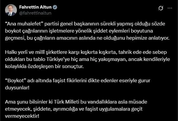 İletişim Başkanı Fahrettin Altun sosyal medya hesabından yaptığı paylaşımda, "‘Ana muhalefet’ partisi genel başkanının sürekli yapmış olduğu sözde boykot çağrılarının işletmelere yönelik şiddet eylemleri boyutuna geçmesi, bu çağrıların amacının aslında ne olduğunu hepimize anlatıyor. Halkı yerli ve milli şirketlere karşı kışkırta kışkırta, tahrik ede ede sebep oldukları bu tablo Türkiye’ye hiç ama hiç yakışmayan, ancak kendileriyle kolaylıkla özdeşleşen bir sonuçtur. ‘Boykot’ adı altında faşist fikirlerini dikte edenler eseriyle gurur duysunlar! Ama şunu bilsinler ki Türk milleti bu vandallıklara asla müsaade etmeyecek, şiddete, ayrımcılığa ve faşist uygulamalara geçit vermeyecektir" ifadelerine yer verdi.