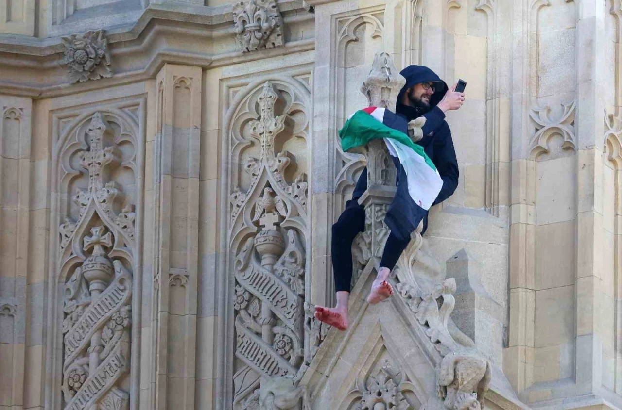 İngiltere’nin simgelerinden Big Ben Saat Kulesi’ne tırmanarak, Filistin bayrağı açan şahıs, acil servis görevlilerinin saatler süren müzakeresine rağmen henüz aşağı inmedi.