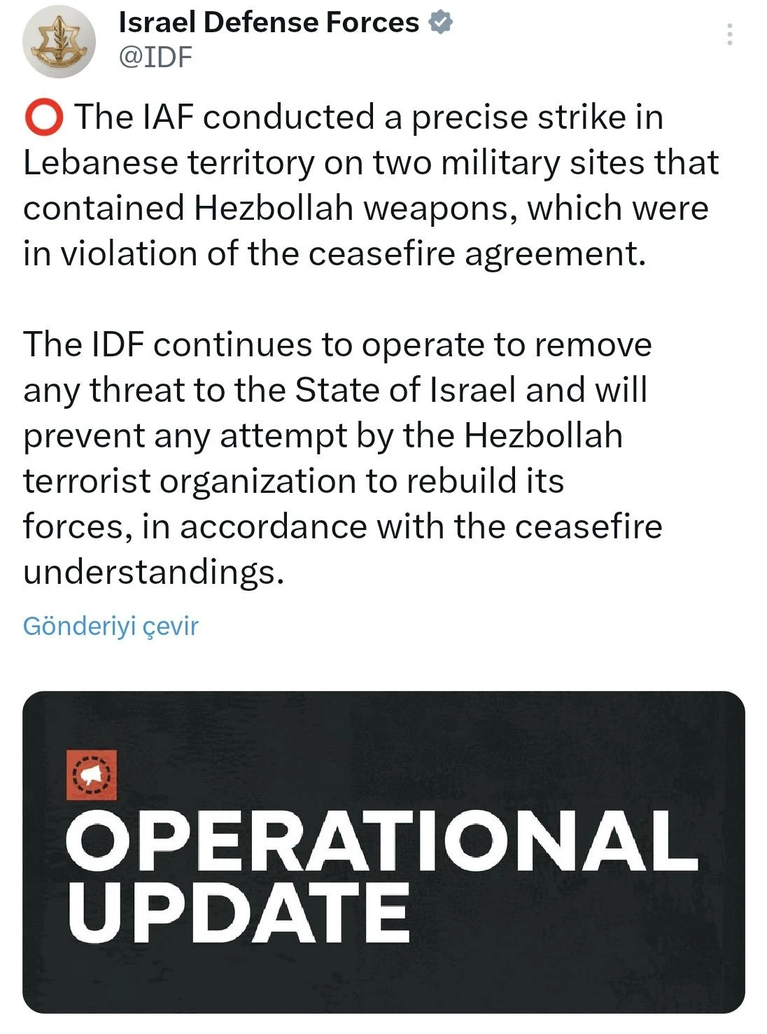 İsrail ordusu, Lübnan topraklarındaki Hizbullah’a ait iki askeri hedefe yönelik hava saldırıları düzenlendiğini açıkladı.