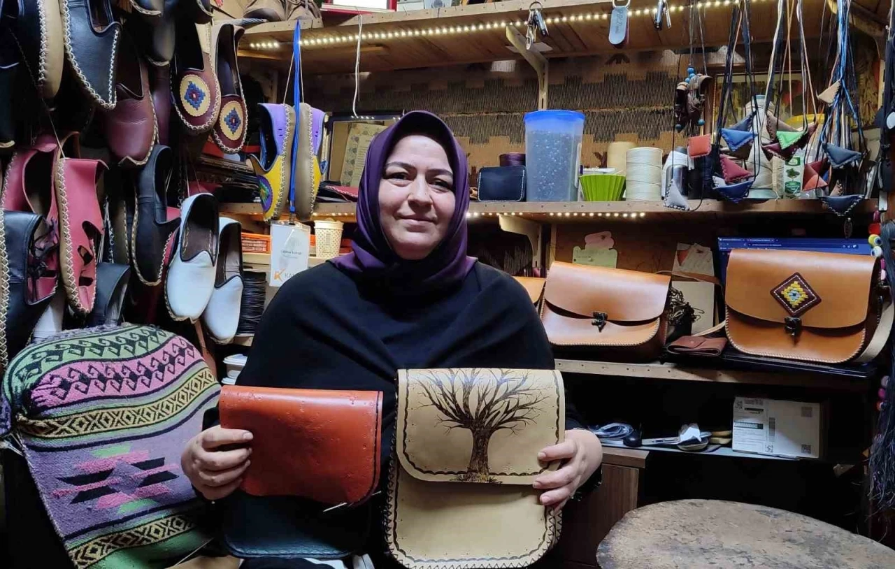 Kahramanmaraş’ta 32 yıldır dede ve babasının mesleğini sürdüren esnaf kadının, ürettiği deri çantalar rağbet görüyor.