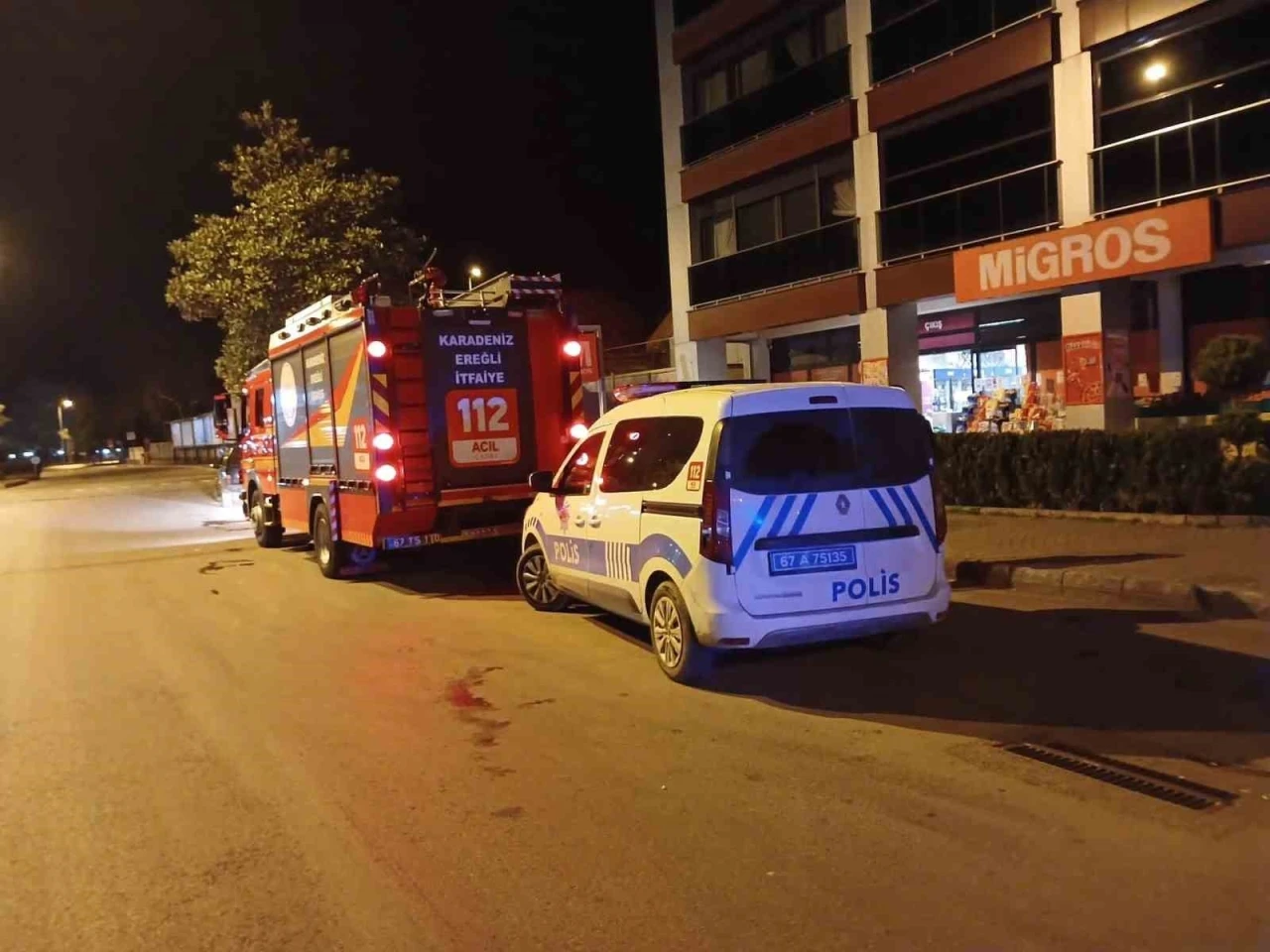 Yangın, Karadeniz Ereğli ilçesinde gece saatlerinde meydana geldi. Migros’un bulunduğu binanın alt katında dumanların yükseldiğini fark eden vatandaşlar durumu 112 Acil Çağrı Merkezi’ne bildirdi. Kısa sürede olay yerine itfaiye ve polis ekipleri sevk edildi. Yangın, itfaiyenin müdahalesiyle büyümeden kontrol altına alındı. Polis çevrede güvenlik önlemleri alırken olayda herhangi bir yaralanma veya can kaybı yaşanmadığı öğrenildi. Yangının çıkış nedeni araştırılıyor.