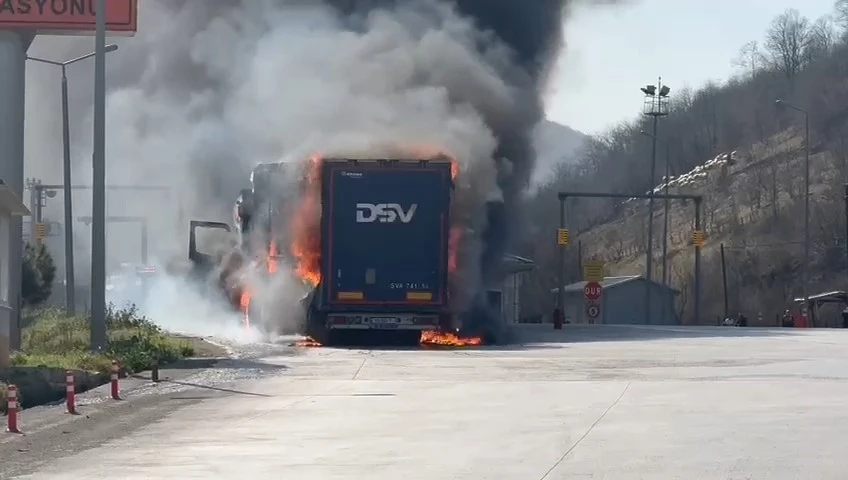 Gürcistan Tiflis’ten Kütahya’ya hurda karton götüren tır, Samsun’da Karayolları Denetleme İstasyonu’nda alev alev yandı.