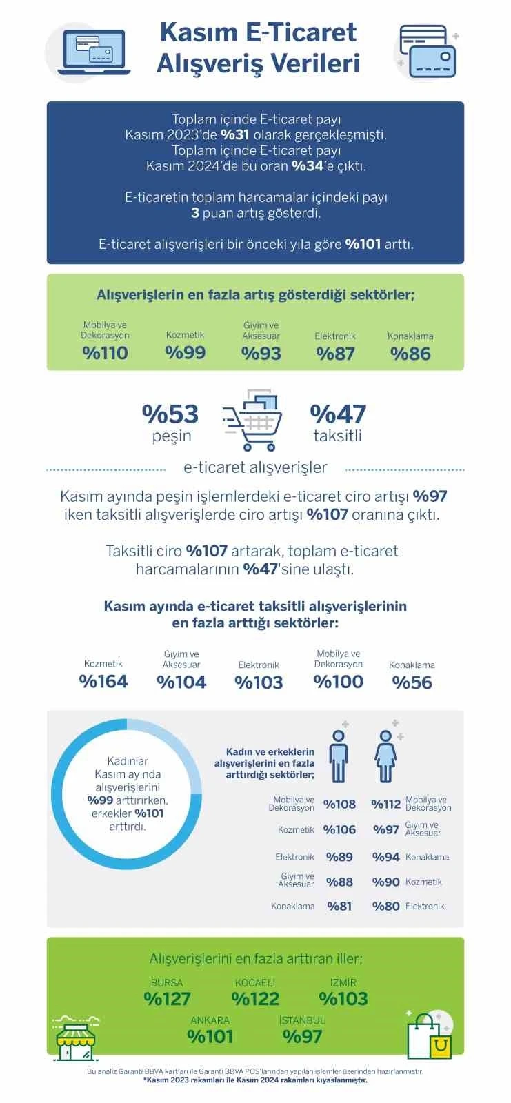 Kampanyaların desteğiyle e-ticaret alışveriş hacminin zirveye çıktığı Kasım’da kadın tüketiciler harcamalarını geçen yıla oranla yüzde 99 arttırırken, en çok ilgiyi sırasıyla Mobilya-Dekorasyon, Kozmetik ve Elektronik sektörlerine gösterdi. Erkeklerin harcamaları da yüzde 101 arttı ve erkek tüketiciler tercihlerini sırasıyla Mobilya-Dekorasyon, Giyim&Aksesuar ve Konaklama yönünde kullandılar. Bursa ve Kocaeli e-ticaret alışveriş hacminin en fazla arttığı şehirler oldu