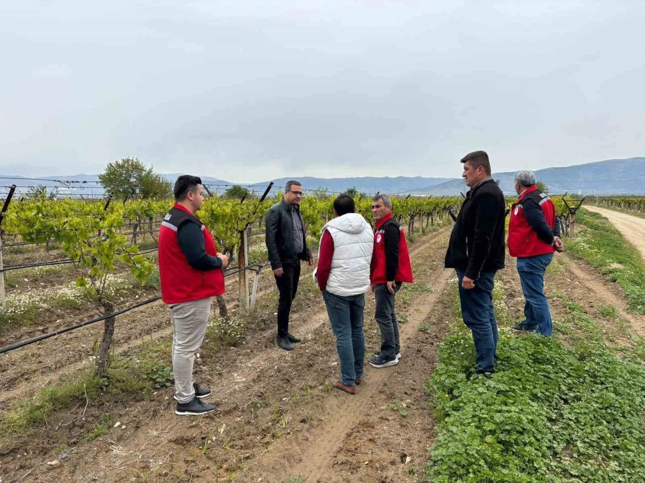 Sarıgöl Kaymakamı Halil Dalak ve Sarıgöl İlçe Tarım ve Orman Müdürü Ahmet Akar ile birlikte don olayından zarar gören bağlarda incelemelerde bulunarak üreticilere geçmiş olsun dileklerini iletti.