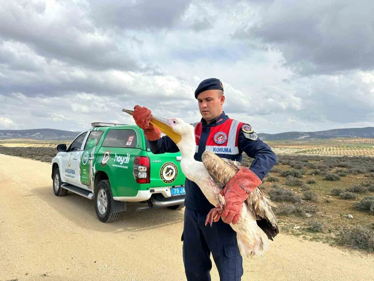 Kilis’te jandarma ekiplerince yaralı ve bitkin halde bulunan pelikan, Doğa Koruma ve Milli Parklar ekiplerine teslim edildi.
