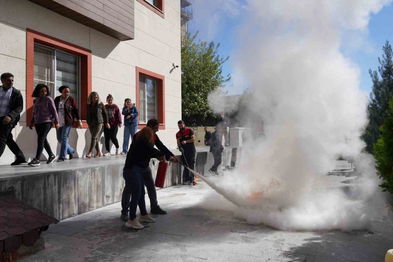 Tatbikatta yangın önleyici tedbirler ve olası yangın sırasında yapılması gerekenler itfaiye ekiplerince personele ve öğrencilere anlatıldı. Yangına müdahale eğitimi verilen etkinlikte itfaiyeciler, yangına müdahale aşamalarını uygulamalı olarak gösterdi.