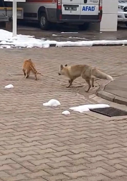 Gümüşhane’nin Oltanbey Mahallesi’nde geçtiğimiz günlerde aç kaldığı için site bahçesini mesken tutan ‘Boncuk’ isimli tilki aynı mahallede bu sefer de bir sokak kedisiyle oyun oynarken görüntülendi. Bir kamu kurumuna ait bahçede karşılaştığı kediye ilk önce tedbirli yaklaşan tilki, daha sonra kediyle oyun oynadı.