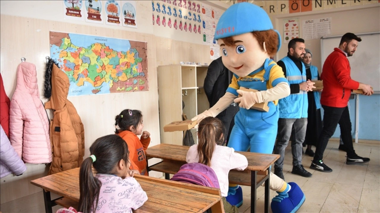 Şanlıurfa'nın Siverek ilçesinde Türkiye Gençlik Vakfı (TÜGVA) ve bir pizza işletmecisi tarafından sosyal sorumluluk projesi kapsamında kırsaldaki okullarda maskot "Neşeli" eşliğinde pizza dağıtılıyor.