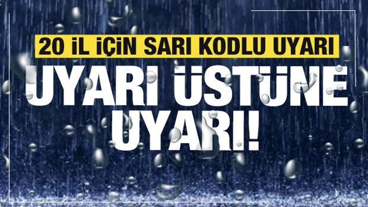 Meteoroloji, 23 Nisan hava durumu raporunu yayımladı. 20 il için sarı kodla uyarı yapılırken; Balıkesir, Sakarya, Afyon, Denizli, İzmir, Muğla, Adana, Antalya, Burdur, Hatay, Ankara, Eskişehir, Konya, Sivas, Bolu, Karabük, Sinop, Zonguldak, Amasya, Rize, Samsun, Trabzon, Erzurum, Kars, Malatya, Adıyaman, Diyarbakır, Antep ve Mardin'de sağanak ve gök gürültülü sağanak bekleniyor. Rüzgârın, Akdeniz'in iç kesimleri, İç Anadolu'nun güneyi ve Doğu Anadolu’nun güneydoğusunda güney ve güneybatı yönlerden kuvvetli esmesi bekleniyor.