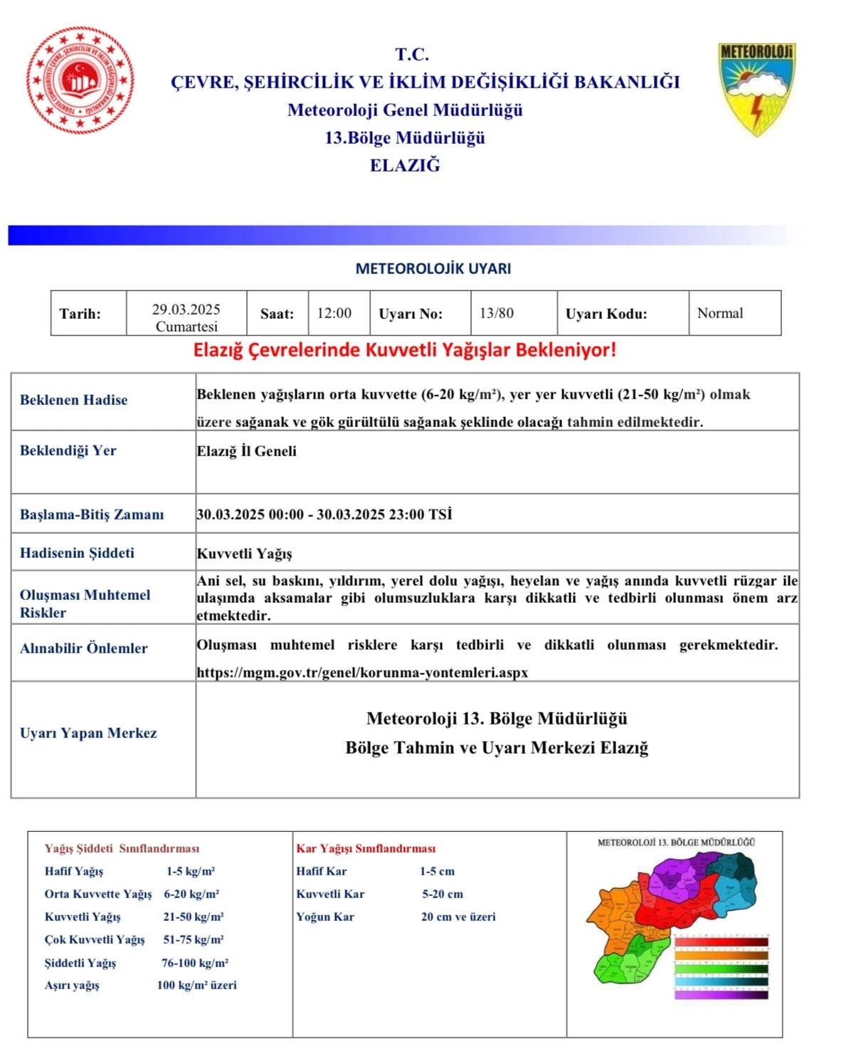 Meteoroloji 13. Bölge Müdürlüğü, bölge genelinde beklenen kuvvetli yağışlar nedeniyle vatandaşları uyardı. Yapılan açıklamada, ani sel, su baskını, yıldırım, yerel dolu yağışı, heyelan ve yağış anında kuvvetli rüzgar gibi olumsuzlukların yaşanabileceği belirtildi. Özellikle ulaşımda aksamalar gibi risklere karşı dikkatli ve tedbirli olunması gerektiği vurgulandı. Yağışların ani ve şiddetli olabileceği ifade edilirken, vatandaşların gerekli önlemleri alarak can ve mal kaybını önlemek adına dikkatli olmaları istendi.