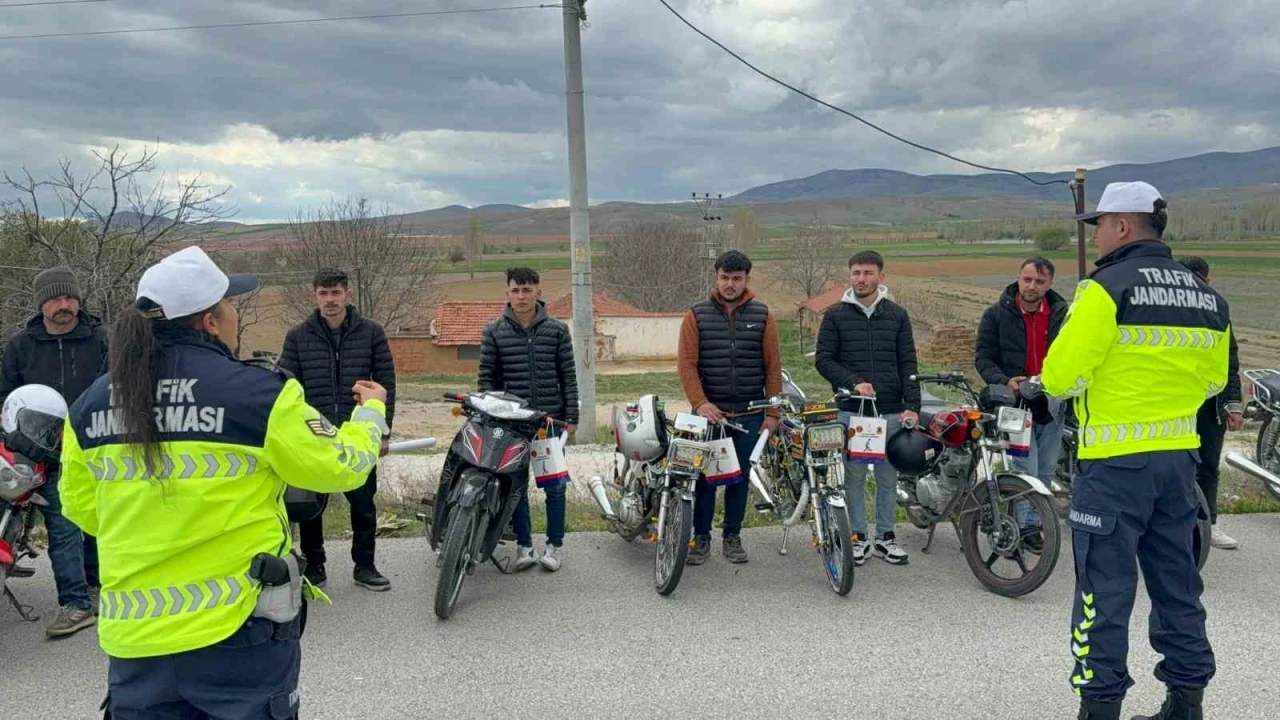Afyonkarahisar’ın Bolvadin ilçesinde jandarma ekipleri tarafından ‘1 kural bir ömür’ projesi çerçevesinde motosiklet kullanıcılarına eğitim verilip, reflektör ve kask dağıtıldı.