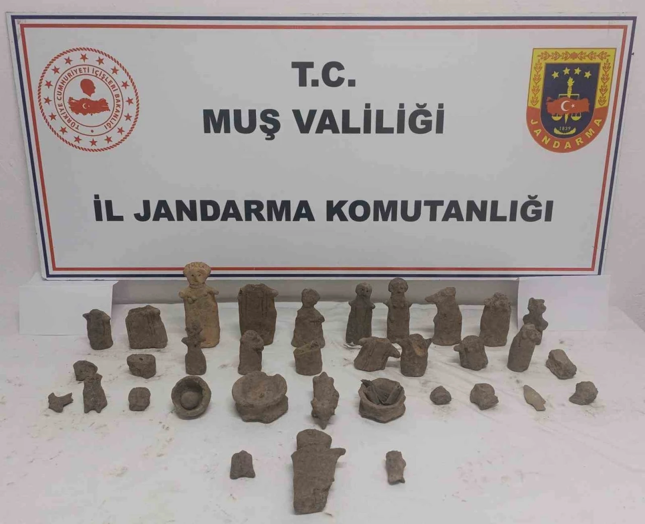 Muş Valiliğinden yapılan açıklamada, İl Jandarma Komutanlığı Kaçakçılık ve Organize Suçlarla Mücadele Şubesi ile İstihbarat Şubesi ekiplerinin kaçakçılıkla mücadele kapsamında yürüttüğü çalışmaların devam ettiği belirtildi. Açıklamada, "Şenoba köyü mülki sınırları içinde KOM ve İstihbarat Şube Müdürlüğünce F.M. (34) isimli şahsın elinde tarihi eser olduğuna dair elde edilen istihbari bilgiler neticesinde CMK’nın 160 ve 161’nci maddeleri çerçevesinde Muş Cumhuriyet Savcısından alınan görevlendirme kararı gereği şüpheli şahısla irtibat kurularak 11 Nisan 2025 günü D-955 karayolu (Muş-Bingöl karayolu) üzerinde buluşma sağlanarak, F.M. ve C.S. (31) isimli şahıslar 42 parça tarihi eser olduğu değerlendirilen 4 bin yıl öncesi Demir Çağı Dönemi’ne ait heykel ve diğer objeler ile birlikte suçüstü yakalanmıştır" denildi.