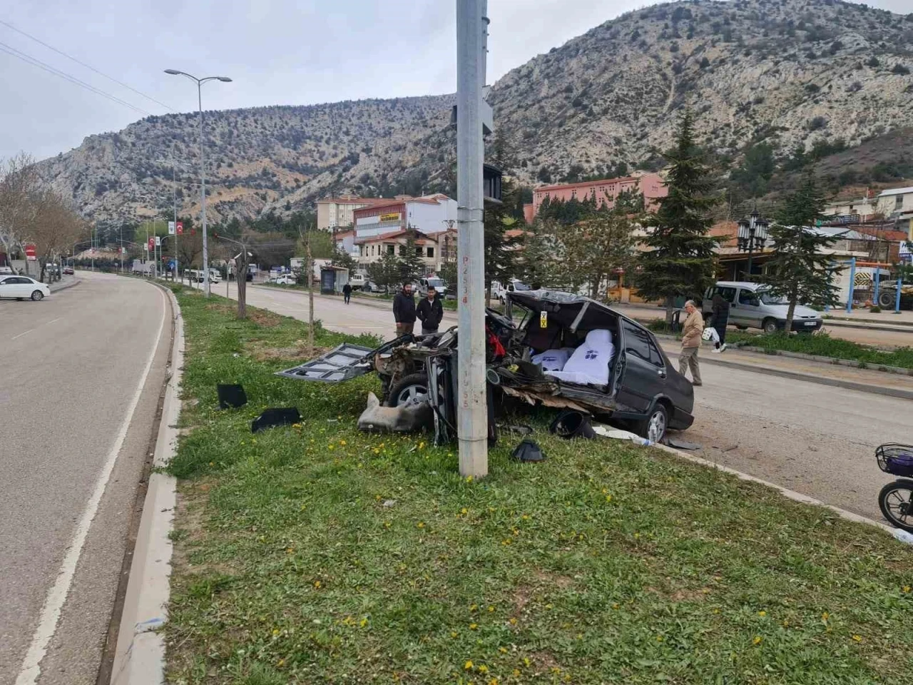 Ankara’nın Nallıhan ilçesinde meydana gelen kazada elektrik direğine çarpan araç ikiye bölündü.