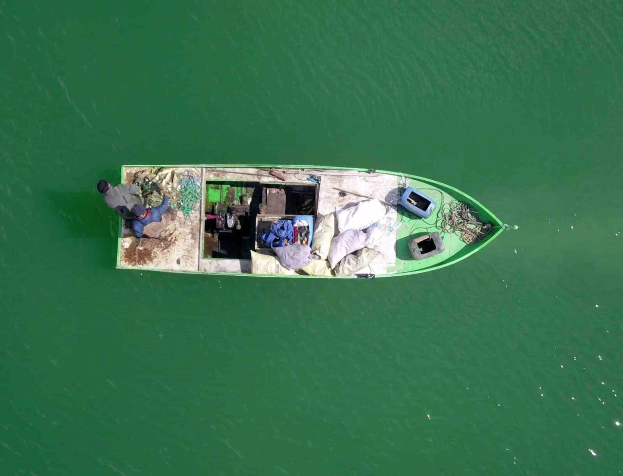 Bitlis’in Ahlat ilçesindeki Nazik Gölü’nde yasak öncesi tekneleri ile balık avı yapan avcılar dron ile görüntülendi.
