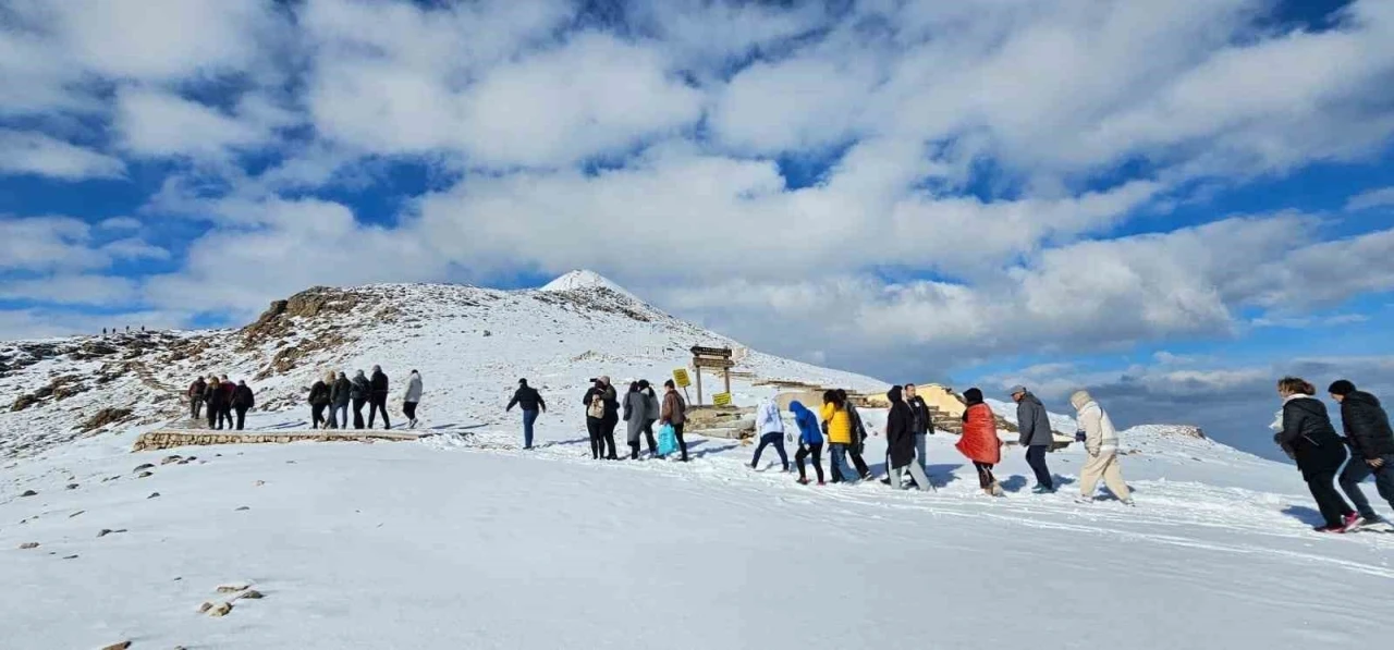 Adıyaman’ın Kahta ilçesindeki Nemrut Dağı’nı ziyarete gelen turistler, Nisan ayının ortalarında kar sürprizi ile karşılaştı.