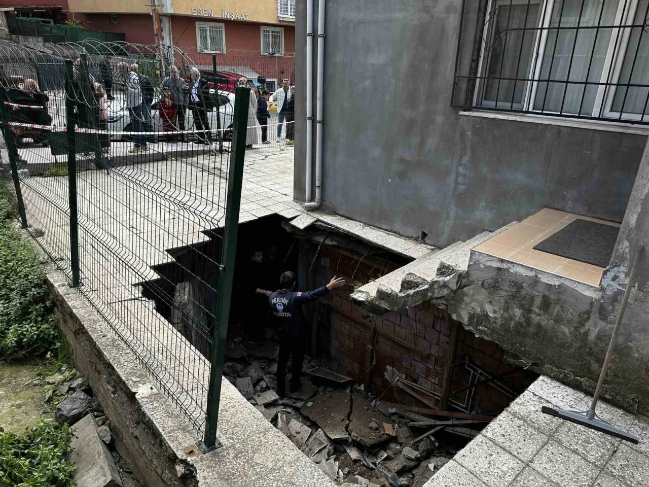Pendik’te dört katlı binanın bahçe zemininin bir bölümü çöktü. Olayda şans eseri yaralanan olmadı.