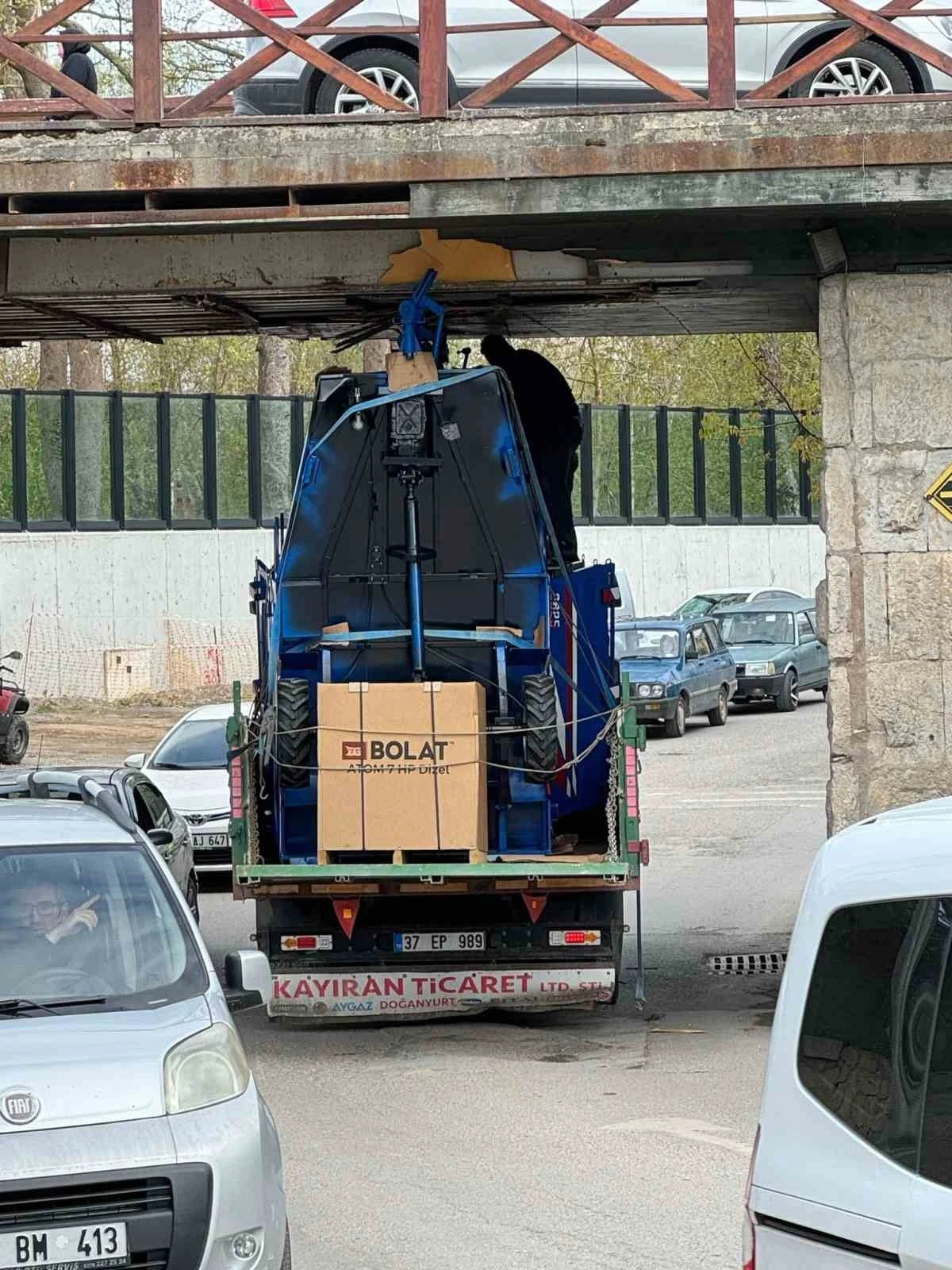 Bartın’da römork yüklü kamyon, köprüye takıldı. Yaklaşık 1.5 saatlik çalışmanın ardından kamyon sıkıştığı yerden kurtarıldı.