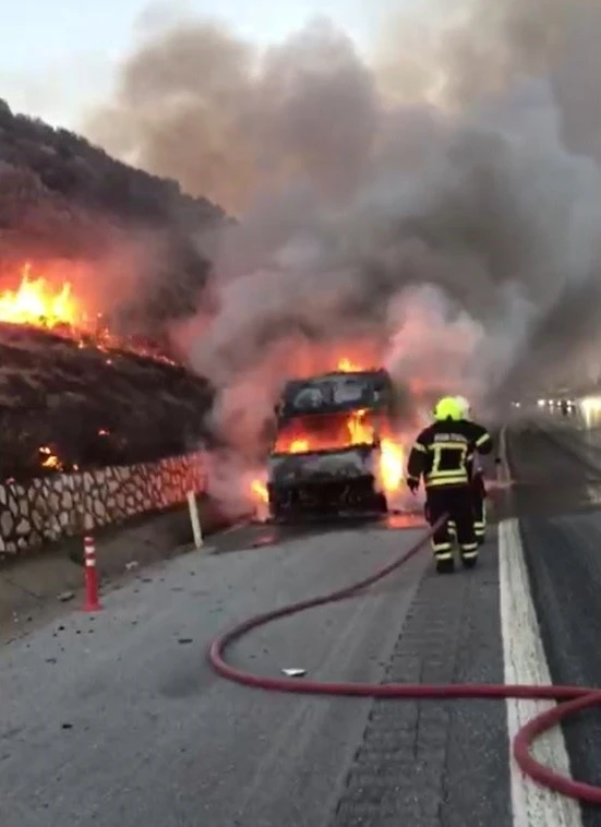 Mersin’in Tarsus ilçesinde otoyolda servis aracı yandı, yangın otoyol kenarında bulunan çalılara da sıçradı.