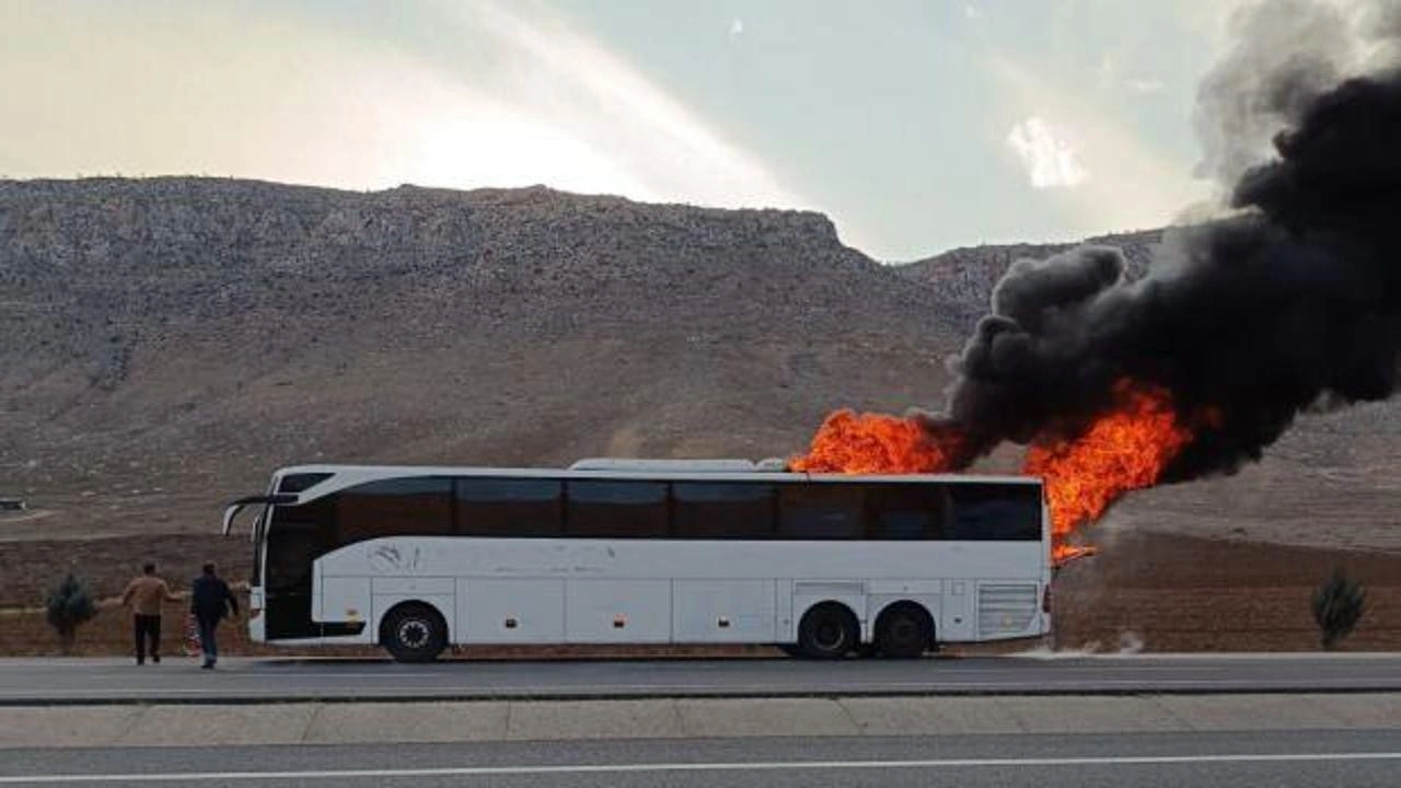 Otobüs şoförü alevleri fark edince aracı emniyet şeridine çekerek yolcuları tahliye etti.