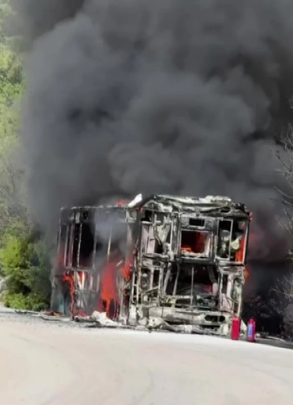 Antalya’da seyir halindeki halk otobüsü alevlere teslim oldu. Yangın sonrası halk otobüsünden geriye demir yığını kaldı.