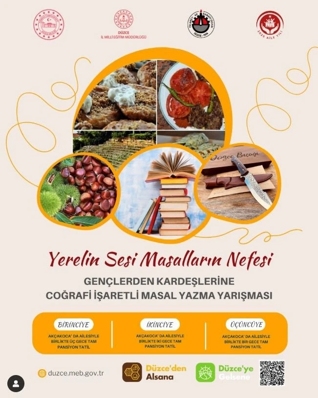 Düzce Valiliği himayelerinde, Milli Eğitim Müdürlüğü ve Düzce Ticaret ve Sanayi Odası iş birliğiyle, Turizm Haftası dahilinde düzenlenen gençlerden kardeşlerine coğrafi işaretli masal yazma yarışması düzenleniyor.