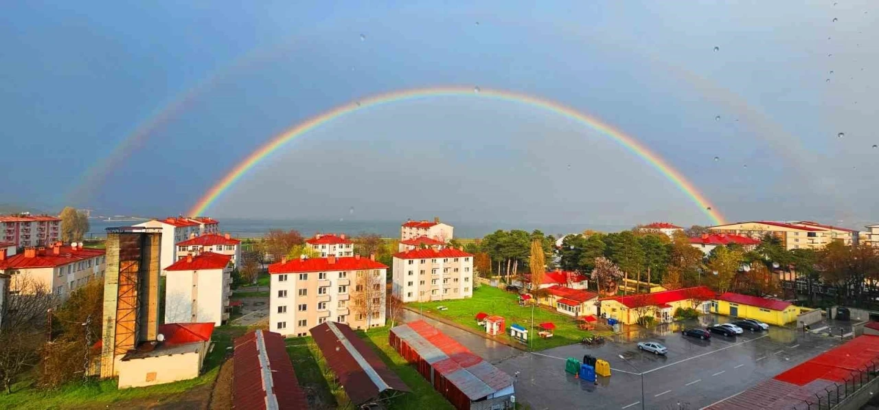 Çift gökkuşağının da zaman zaman belirdiği manzara, sosyal medyada da kısa sürede ilgi gördü.