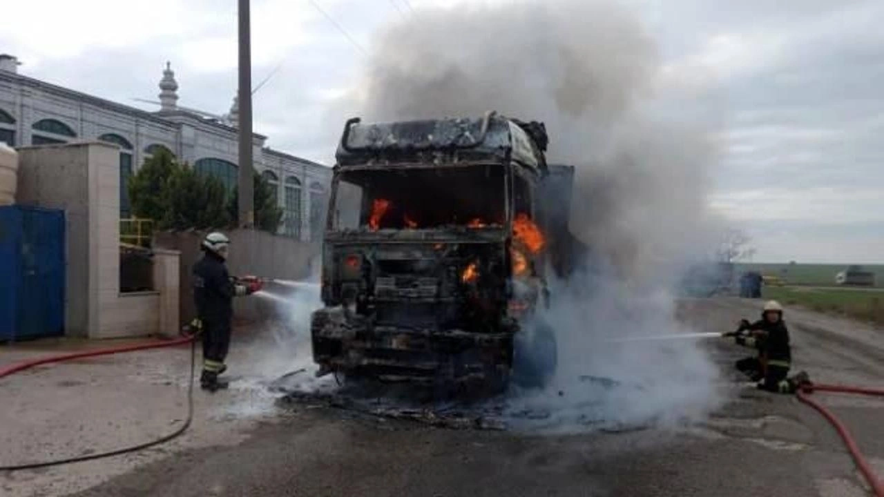 Tekirdağ'ın Ergene ilçesinde Marmaracık Mahallesi'nde park halindeki 34 DYT 388 plakalı tırda henüz belirlenemeyen nedenle yangın çıktı.