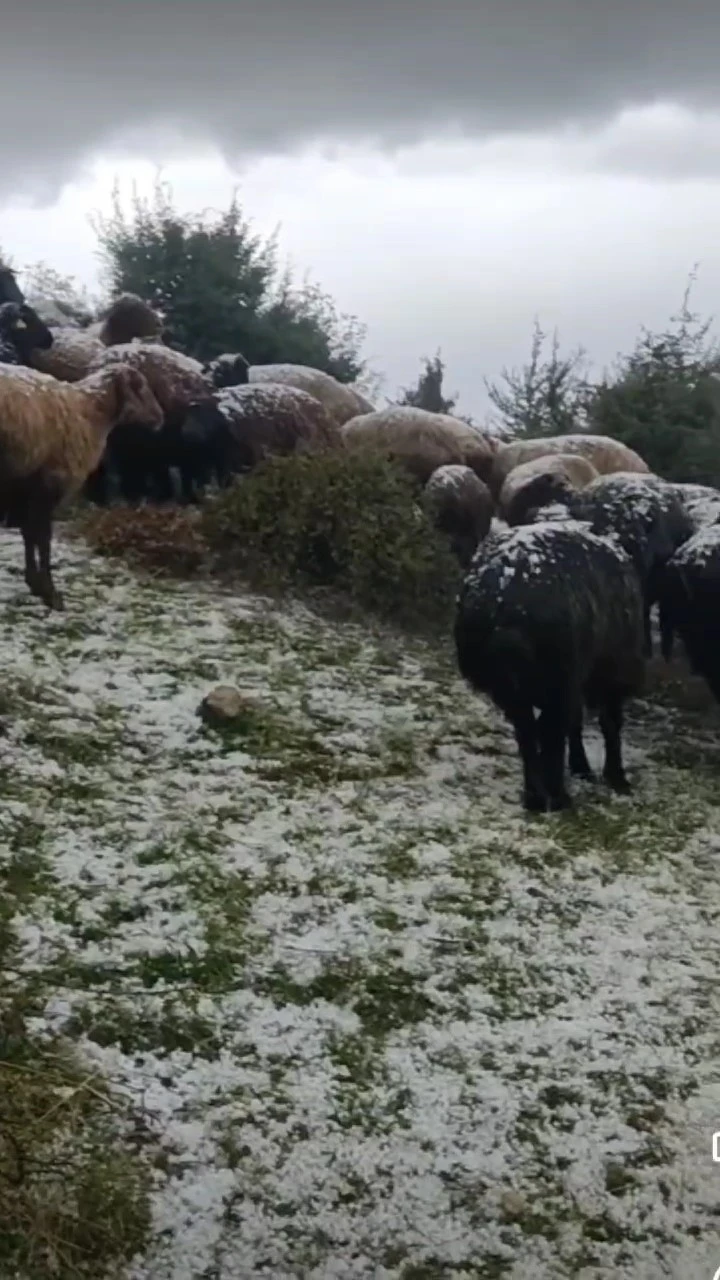 Tokat’taki Kızkayası Yaylası’nda aniden başlayan dolu yağışı çevreyi beyaza bürürken, hayvanlarını otlatan çoban zor anlar yaşadı.
