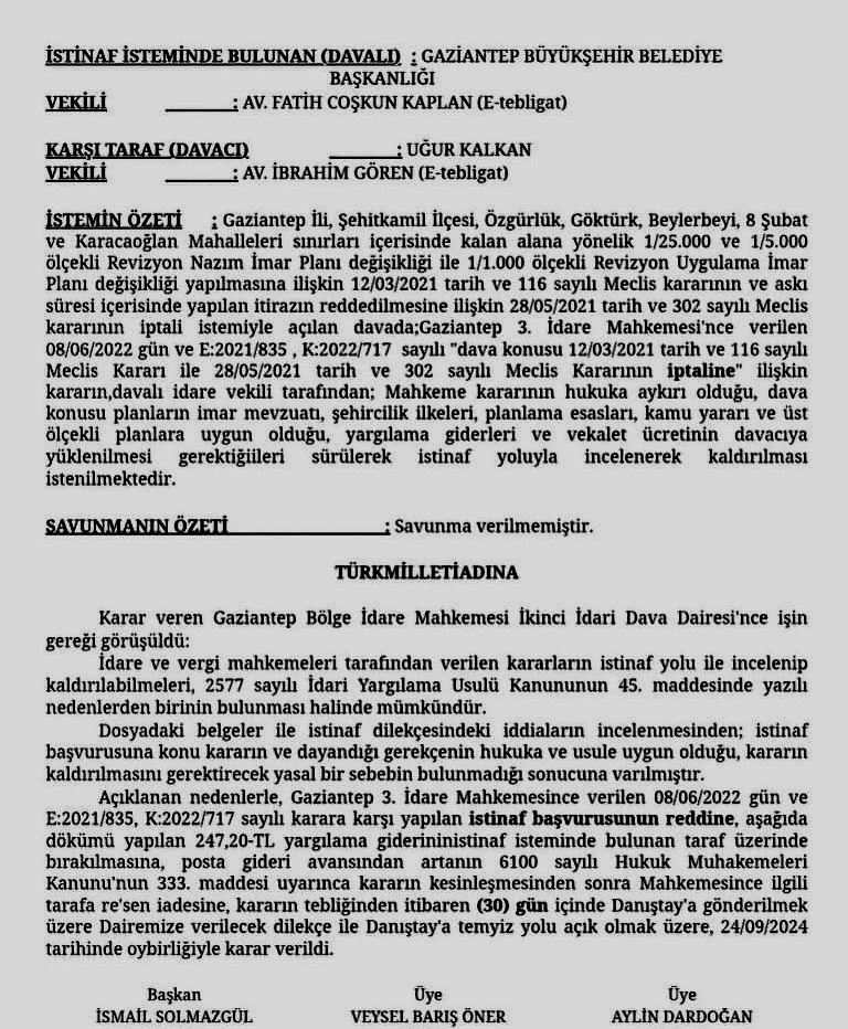 Karara göre, Gaziantep Büyükşehir Belediyesi’nin 12 Mart 2021 tarihli ve 116 sayılı meclis kararı ile aldığı imar planı değişiklikleri, planlama esaslarına ve hukuka aykırı bulundu. Mahkeme, belediyenin itirazında haklı bir gerekçe olmadığını belirterek, 24 Eylül 2024 tarihinde oybirliğiyle istinaf başvurusunu reddetti.