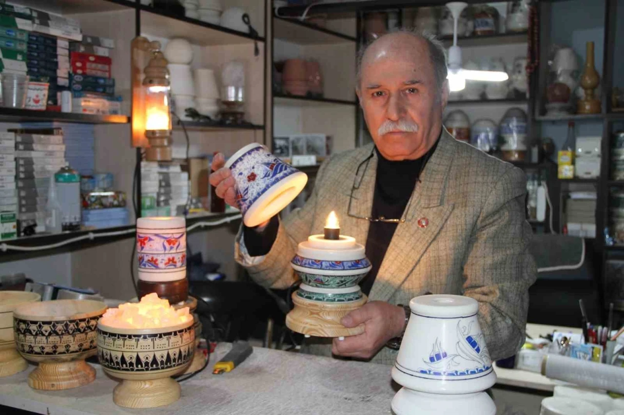 Çankırı’da emekli olduktan sonra tuz lambalarına çeşitli motifler çizmeye başlayan 70 yaşındaki Mustafa Çağlar, 17 yıldır Çankırı’nın meşhur kaya tuzunu sanatla buluşturuyor.