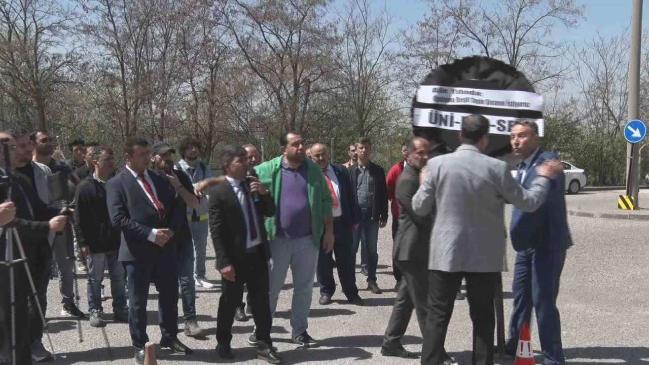 Üniversite İdari Personel Sendikası (ÜNİPERSEN) üyeleri, Yükseköğretim Kurulu (YÖK) kapısına siyah çelenk bırakarak basın açıklaması yaptı.