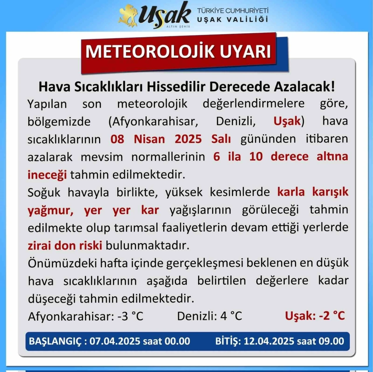 Uşak Valiliği sosyal medya üzerinden yapmış olduğu uyarıda kent genelinde 8 Nisan tarihi itibariyle hava sıcaklıkların 6 ila 10 derece azalacağını ve soğuk hava uyarısında bulundu. Uşak Valiliği sosyal medya üzerinden yapılan paylaşımda hava sıcaklıkların mevsim normallerin altına düşeceğini ve soğuk havayla birlikte tarımsal faaliyetlerin devam ettiği yerlerde zirai don riskine karşı vatandaşları uyararak; "Hava Sıcaklıkları Hissedilir Derecede Azalacak! Yapılan son meteorolojik değerlendirmelere göre, bölgemizde (Afyonkarahisar, Denizli, Uşak) hava sıcaklıklarının 08 Nisan 2025 Salı gününden itibaren azalarak mevsim normallerinin 6 ila 10 derece altına ineceği tahmin edilmektedir. Soğuk havayla birlikte, yüksek kesimlerde karla karışık yağmur, yer yer kar yağışlarının görüleceği tahmin edilmekte olup tarımsal faaliyetlerin devam ettiği yerlerde zirai don riski bulunmaktadır. Önümüzdeki hafta içinde gerçekleşmesi beklenen en düşük hava sıcaklıklarının aşağıda belirtilen değerlere kadar düşeceği tahmin edilmektedir." ifadeleri kullanıldı.