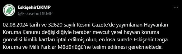DKMP İl Müdürlüğü, alınan kararı sosyal medyadan duyurdu. Yapılan açıklamaya göre, 02 Ağustos 2024 tarih ve 32620 sayılı Resmi Gazete’de yayımlanan Hayvanları Koruma Kanunu değişikliğiyle beraber mevcut yerel hayvan koruma görevlisi kimlik kartlarını iptal edildi. Kartların en kısa sürede Eskişehir DKMP’ye teslim edilmesi gerektiği belirtildi.