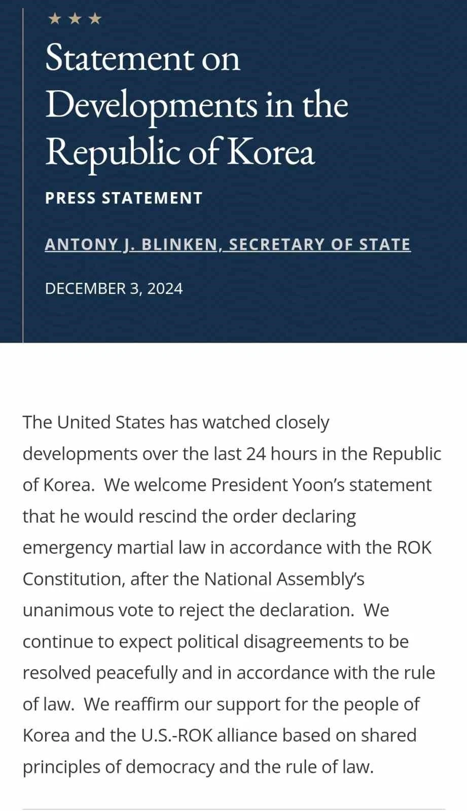ABD Dışişleri Bakanı Antony Blinken, Güney Kore Devlet Başkanı Yoon Suk Yeol’un ilan ettiği sıkıyönetimin yürürlükten kaldırılmasını memnuniyetle karşıladıklarını belirterek, “Siyasi anlaşmazlıkların barışçıl bir şekilde ve hukukun üstünlüğüne uygun olarak çözülmesini bekliyoruz” dedi.