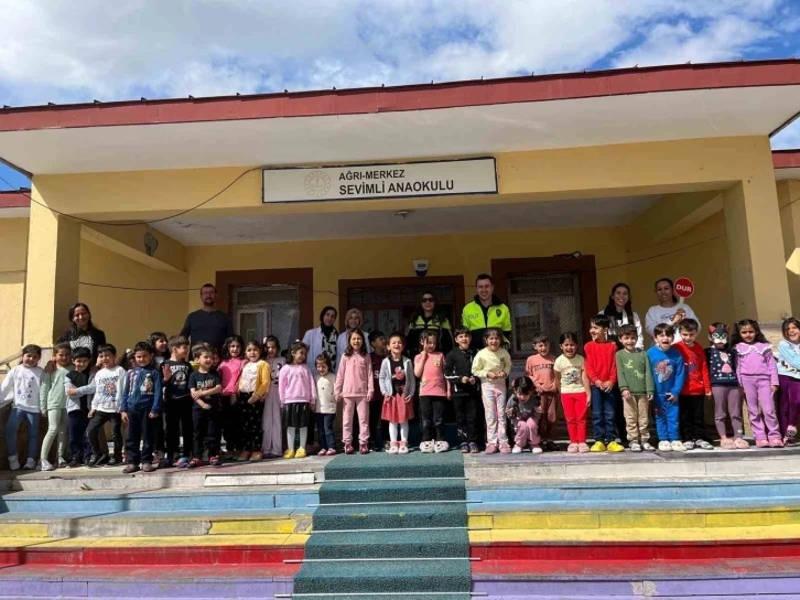Ağrı İl Emniyet Müdürlüğüne bağlı trafik polisleri, “Trafik Haftası” nedeniyle Ağrı Sevimli Anaokulu’nu ziyaret etti. Burada yapılan etkinlikte 40 öğrenciye trafik kuralları anlatılarak, çeşitli hediyeler verildi.