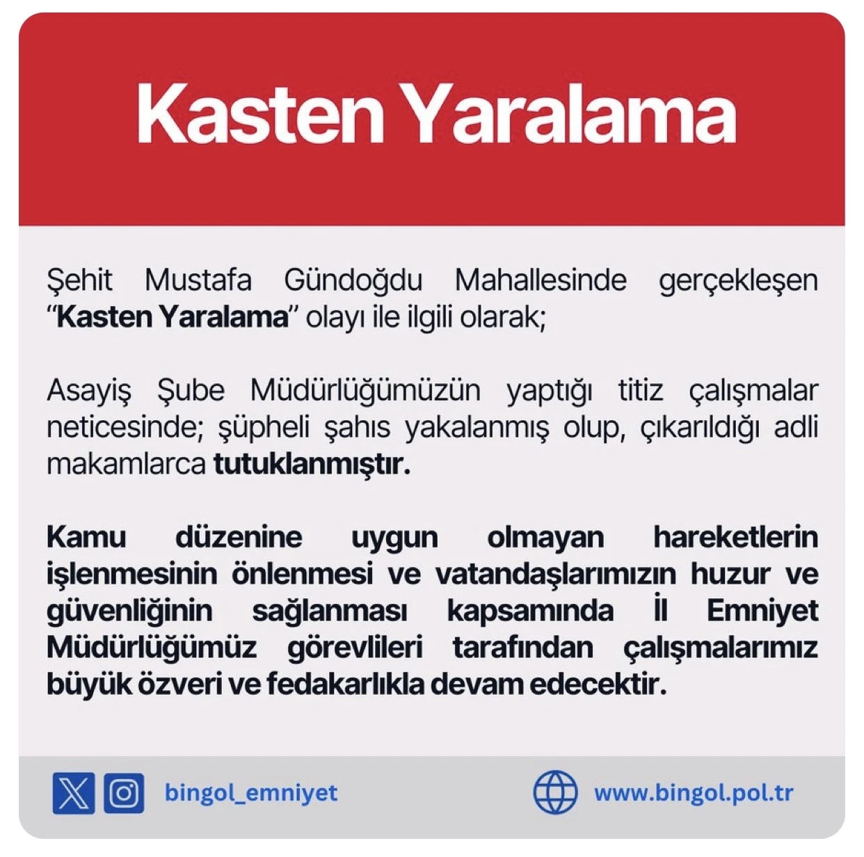 Bingöl İl Emniyet Müdürlüğü’nden yapılan açıklamada, "Şehit Mustafa Gündoğdu Mahallesinde gerçekleşen ‘Kasten Yaralama’ olayı ile ilgili olarak; Asayiş Şube Müdürlüğümüzün yaptığı titiz çalışmalar neticesinde; şüpheli şahıs yakalanmış olup, çıkarıldığı adli makamlarca tutuklanmıştır. Kamu düzenine uygun olmayan hareketlerin işlenmesinin önlenmesi ve vatandaşlarımızın huzur ve güvenliğinin sağlanması kapsamında İl Emniyet Müdürlüğümüz görevlileri tarafından çalışmalarımız büyük özveri ve fedakarlıkla devam edecektir" denildi.