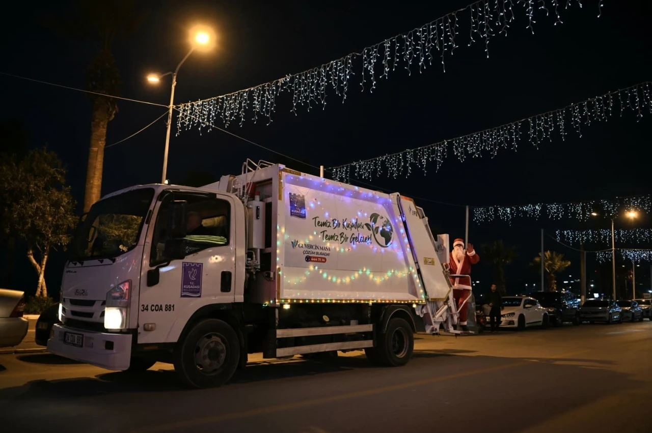 Kuşadası Belediyesi, yeni yıl öncesi çevre temizliğine dikkat çekmek için çöp kamyonlarını ışıklarla süslerken, Noel Baba kostümü giyen personeler ise hem çocukların yüzünü güldürdü hem de çevre bilinci mesajı verdi.