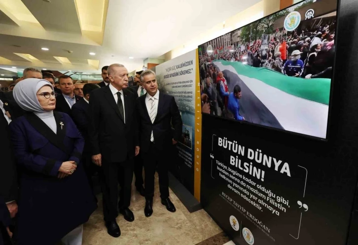 Cumhurbaşkanı Recep Tayyip Erdoğan, Kızılcahamam Kampı’nda kurulan ve İsrail’in yaptığı 76 yıllık zulmü anlatan “Filistin” sergisini gezdi.