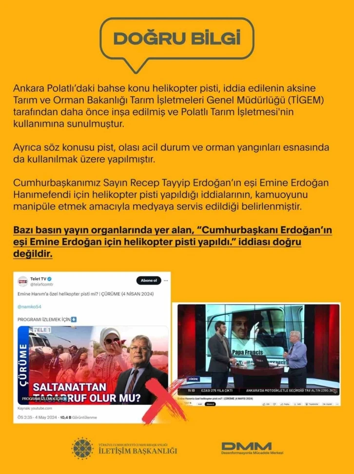 Dezenformasyonla Mücadele Merkezi tarafından yapılan açıklamada, "Cumhurbaşkanı Erdoğan’ın eşi Emine Erdoğan için helikopter pisti yapıldığı" iddialarının gerçeği yansıtmadığı ifade edilerek, bahse konu Polatlı’daki helikopter pistinin iddia edilenin aksine Tarım ve Orman Bakanlığı Tarım İşletmeleri Genel Müdürlüğü (TİGEM) tarafından daha önce inşa edildiği ve pistin Polatlı Tarım İşletmesi’nin kullanımına sunulduğu kaydedildi. Açıklamada, söz konusu pistin muhtemel acil durum ve orman yangınları esnasında da kullanılmak üzere yapıldığı vurgulandı.