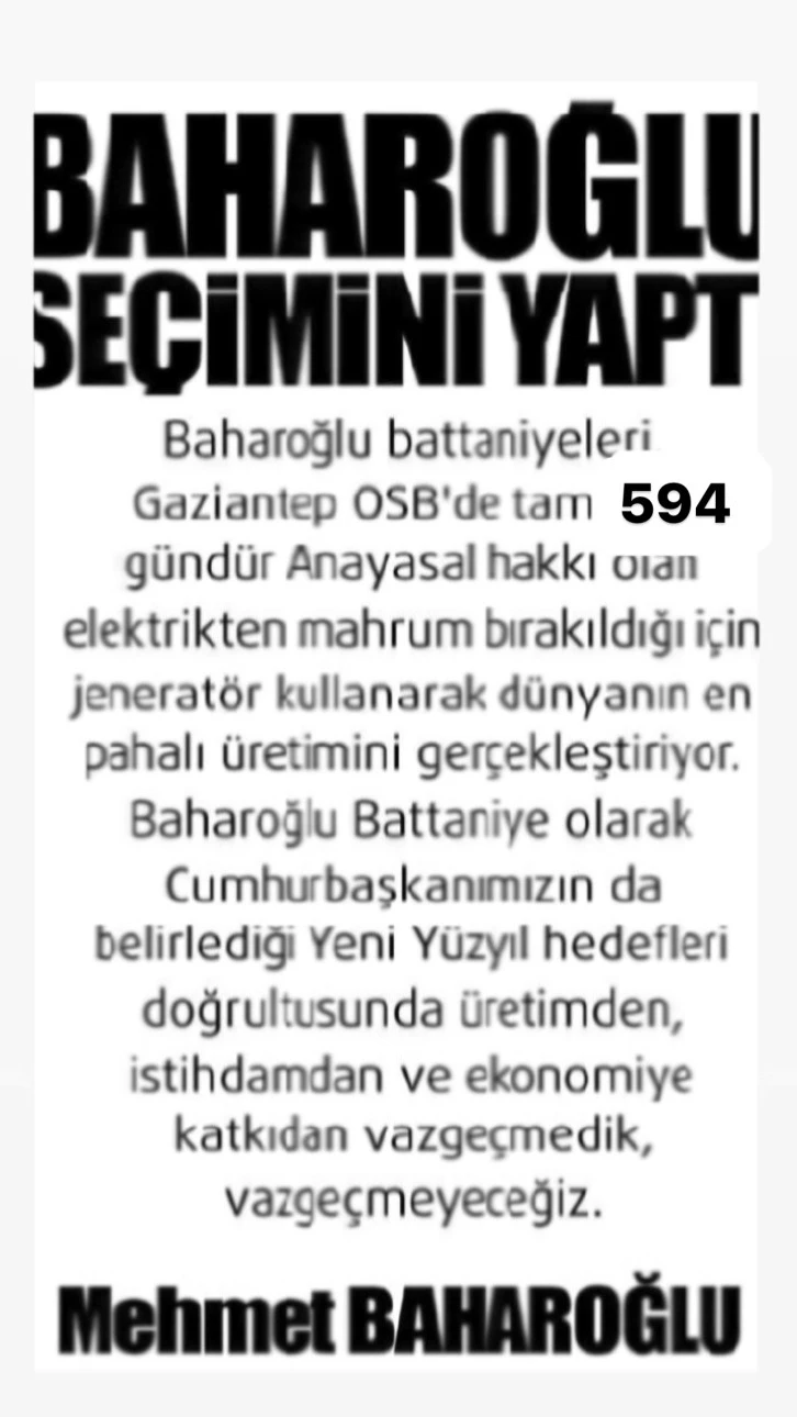 Baharoğlu, Cumhurbaşkanı Recep Tayyip Erdoğan’ın belirlediği yeni yüzyıl hedefleri doğrultusunda elektrikten mahrum bırakıldığını, jeneratörle bile olsa üretime devam ettiklerini ifade ederek, Dünyanın en pahalı üretimini yaptığını söyledi.